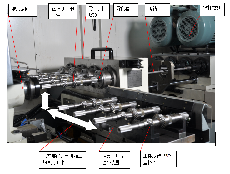 目前大多采用的是四軸數(shù)控深孔鉆床,采用槍鉆法加工。一次可以安裝四支工件,同時(shí)加工四支齒輪軸,加工效率比較高。