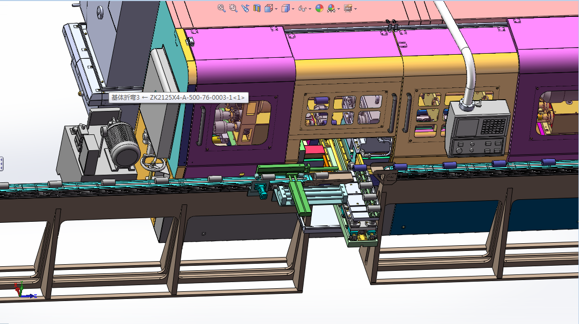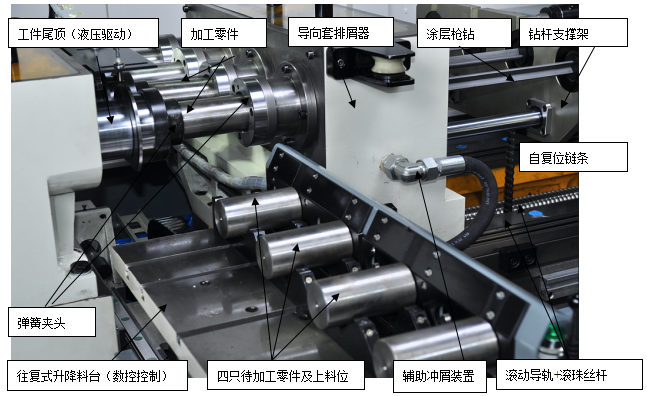 機床具備四主軸、八工位設計,工件采用彈簧夾頭通過零件外圓自動定位夾緊。機床配置伺服驅(qū)動數(shù)控控制的自動往復升降式上料臺,其料臺的數(shù)控橫移、升降以及固定的上下料區(qū)域設計,均可使機床以極好的適應性匹配適宜的如桁架機械手或六軸機器人或功能氣缸等自動化形式,槍鉆工序的整個加工過程則在數(shù)控方式下實現(xiàn)了完全的自動化加工。
