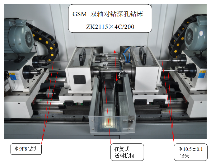 1. 機床結構的選擇:因為φ9f8 (+0.013-0.035)孔徑公差要求非常高,又加之零件為大批量生產,效率要求極高,所以深孔加工過程需要穩(wěn)定可靠,并且要方便刀具及工裝的調整。所以,機床的主軸數量選擇為2軸。如果選用4軸機床,則同時調整4支高精度的刀具,難度很大,也很難保證加工質量。為了提高加工效率,考慮將左側的φ10.5±0.1深孔與φ9f8 (+0.013-0.035)同時加工。這樣可以保證工件一次裝夾,完成左右兩側孔的加工,大大提高了加工效率,加工效率比通常的四軸機床還要高很多。所以機床選擇為雙軸對鉆深孔鉆床。加工孔徑范圍:φ3~φ15。機床結構參見下圖。